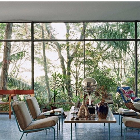 Casa de Vidro, the glass house, she designed for herself and her husband in 1950 was Bo Bardi’s first major project in Brazil. Hovering over the landscape on thin pilotti with glass curtain walls, this house is a classic modernist, jewel box. Similar to California modernist Richard Neutra's work, the home is characterized by its integration of nature into the space through giant glass walls allowing the lush landscape to become the focus. Although the current images show the house surrounded by dense vegetation, the original plot had been completely cleared giving Bo Bardi the opportunity to design the surrounding landscape as well.